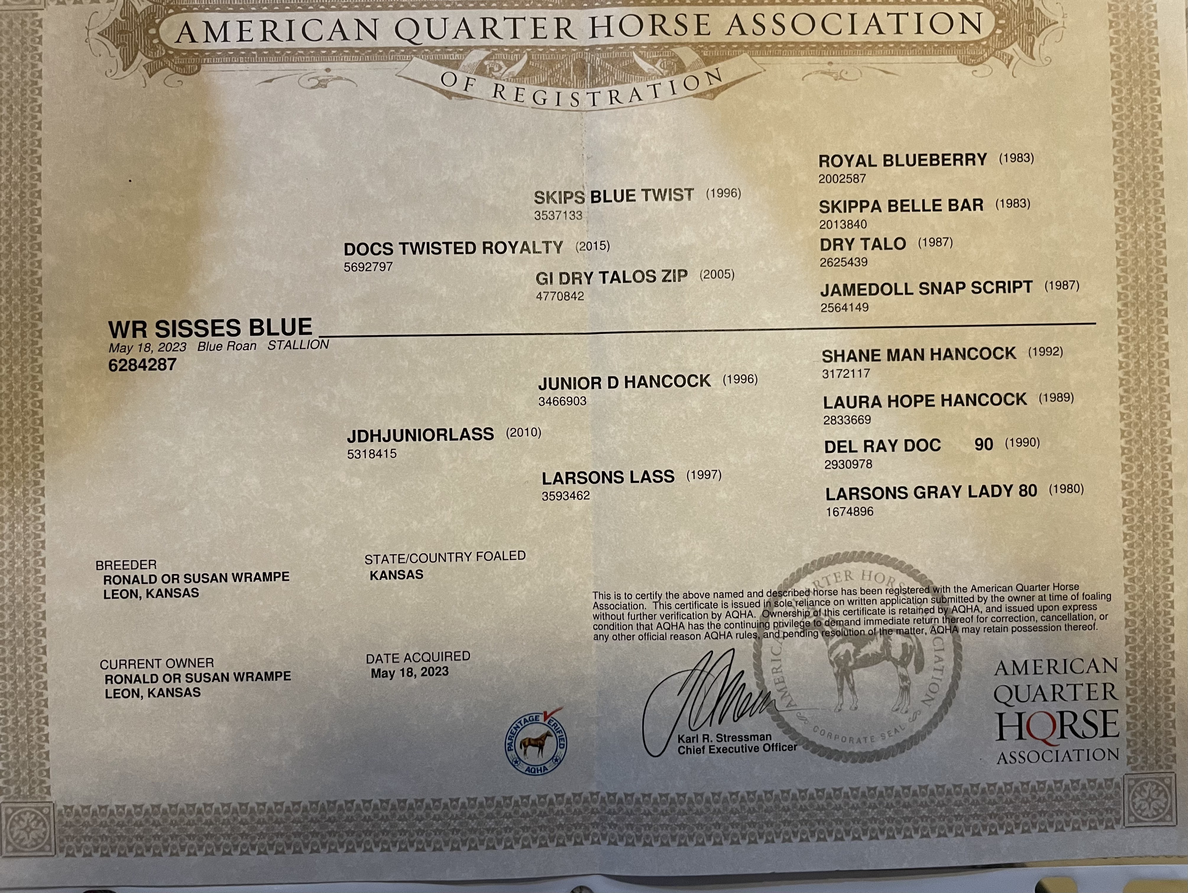- Sire, DOCS TWISTED ROYALTY #5692797, is Foundation bred and stands 15 hands.
